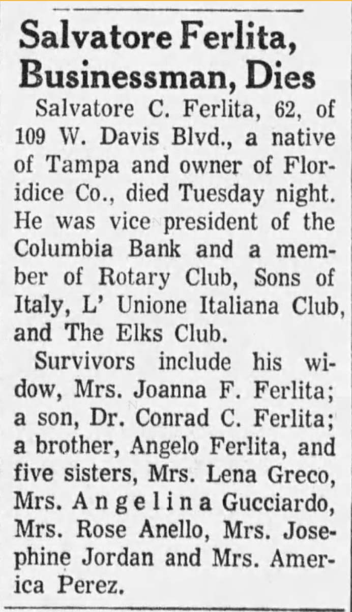 Around the time of Salvatore Ferlita’s death, the City of Tampa moved to purchase the site for a new Nebraska Avenue Park as part of Tampa’s Model Cities program, which allocated federal funding to remove blight in economically distressed areas under Lydon Johnson’s “Great Society” and “War on Poverty” initiatives. Joanna Ferlita sold the Borrell Park site to the City in 1970.